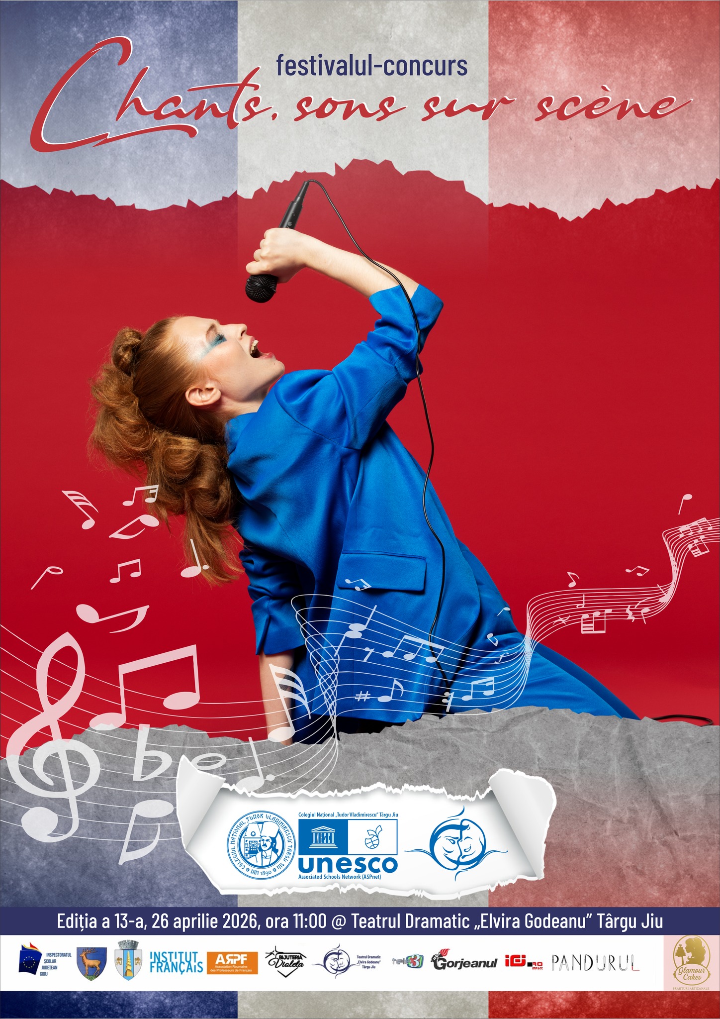 «Chants, sons sur scène» / ediția a 13-a, eveniment organizat de Colegiul Național ,,Tudor Vladimirescu” . Partenerii noștri sunt: Institutul Francez din România, Inspectoratul Școlar Județean Gorj, Consiliul Județean Gorj, Primăria Municipiului Târgu Jiu, Teatrul Dramatic ,,Elvira Godeanu” și Asociația Română a Profesorilor Francofoni – Filiala Gorj.