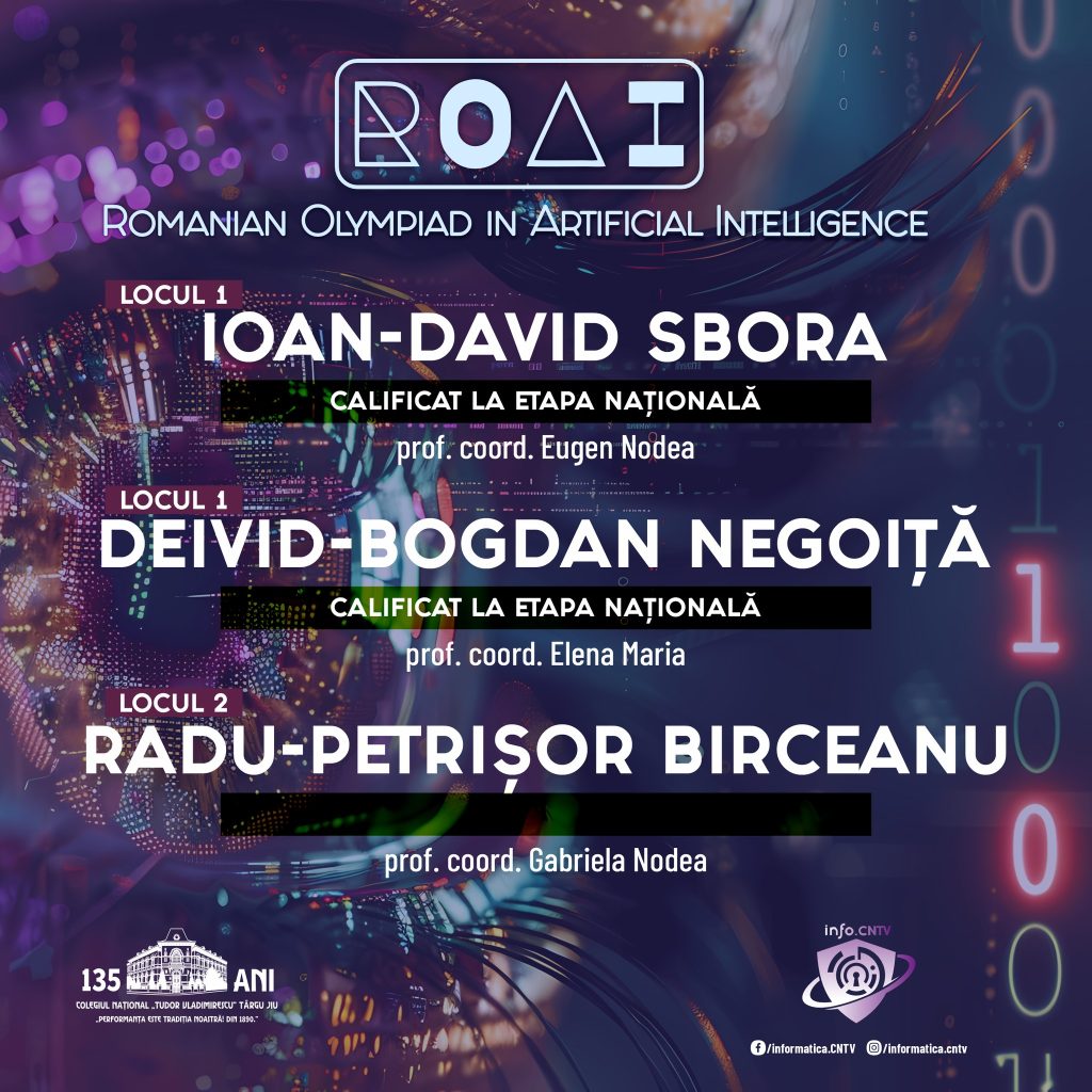 Felicitări elevilor și profesorilor coordonatori pentru rezultatele obținute la Romanian Olympiad in Artificial Intelligence: ROAI – etapa județeană din 8 martie 2026: