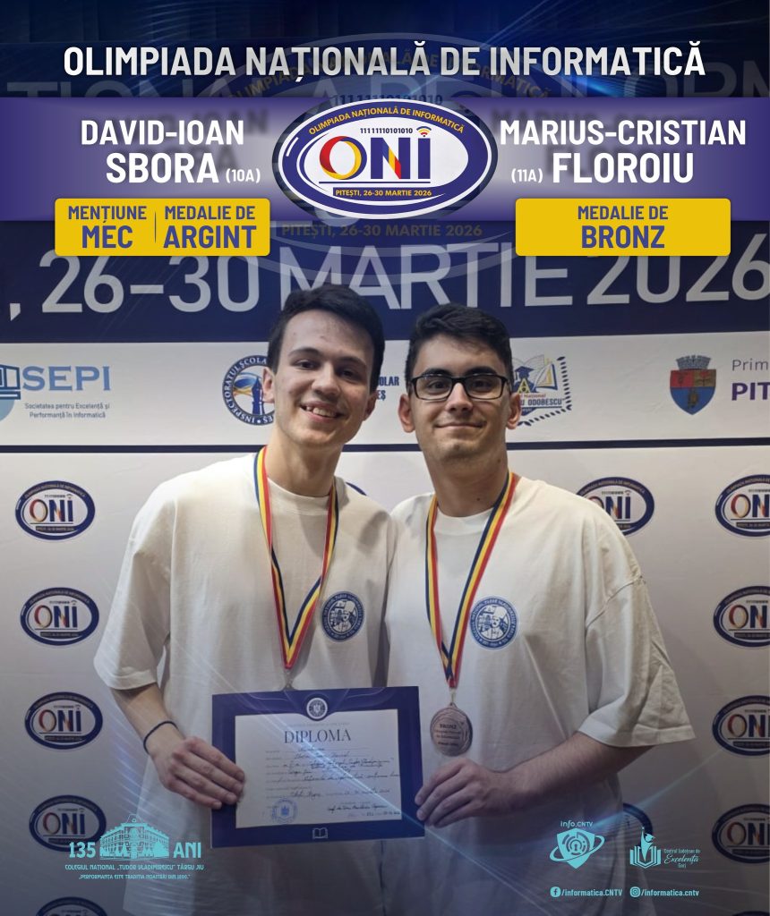 Felicitări elevilor și profesorilor coordonatori pentru rezultatele obținute la Olimpiada Națională de Informatică – Liceu, Pitești, martie 2026!