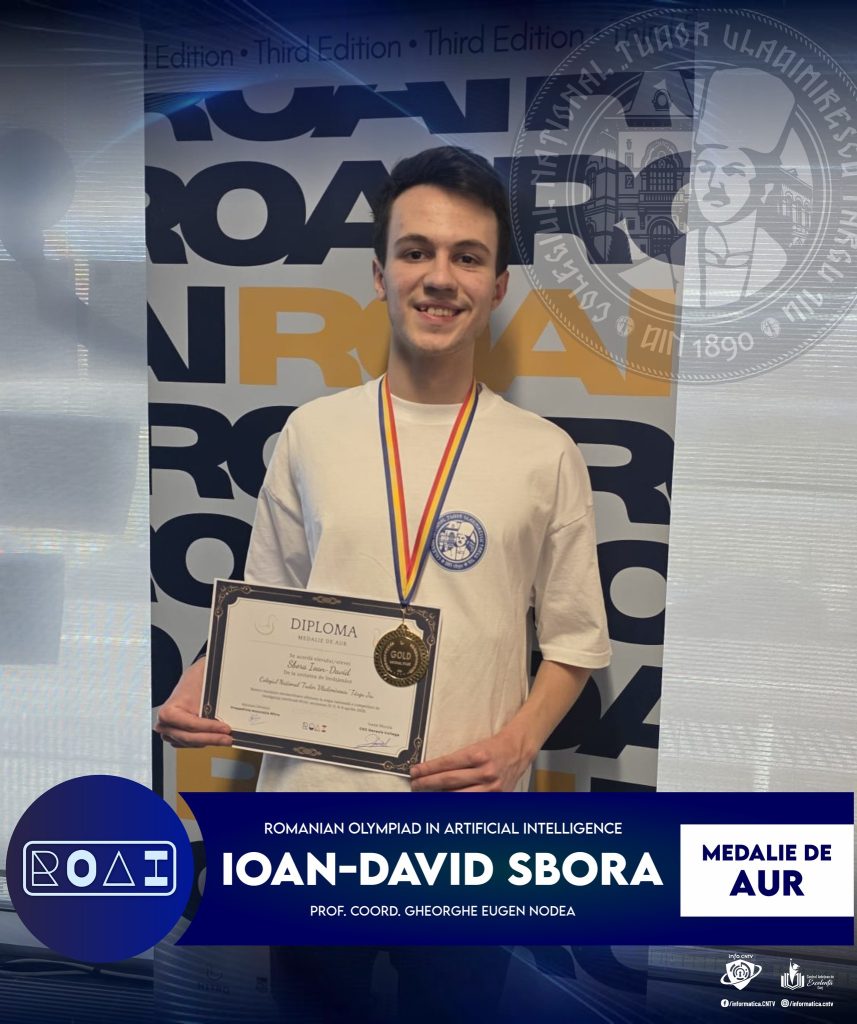 Felicitări elevului nostru, Ioan-David Sbora, 10A, pentru rezultatul extraordinar la obținut la etapa națională a Romanian Olympiad in Artificial Intelligence ROAI: Medalie de Aur (locul 5)! Felicitări domnului profesor coordonator Eugen Nodea!
