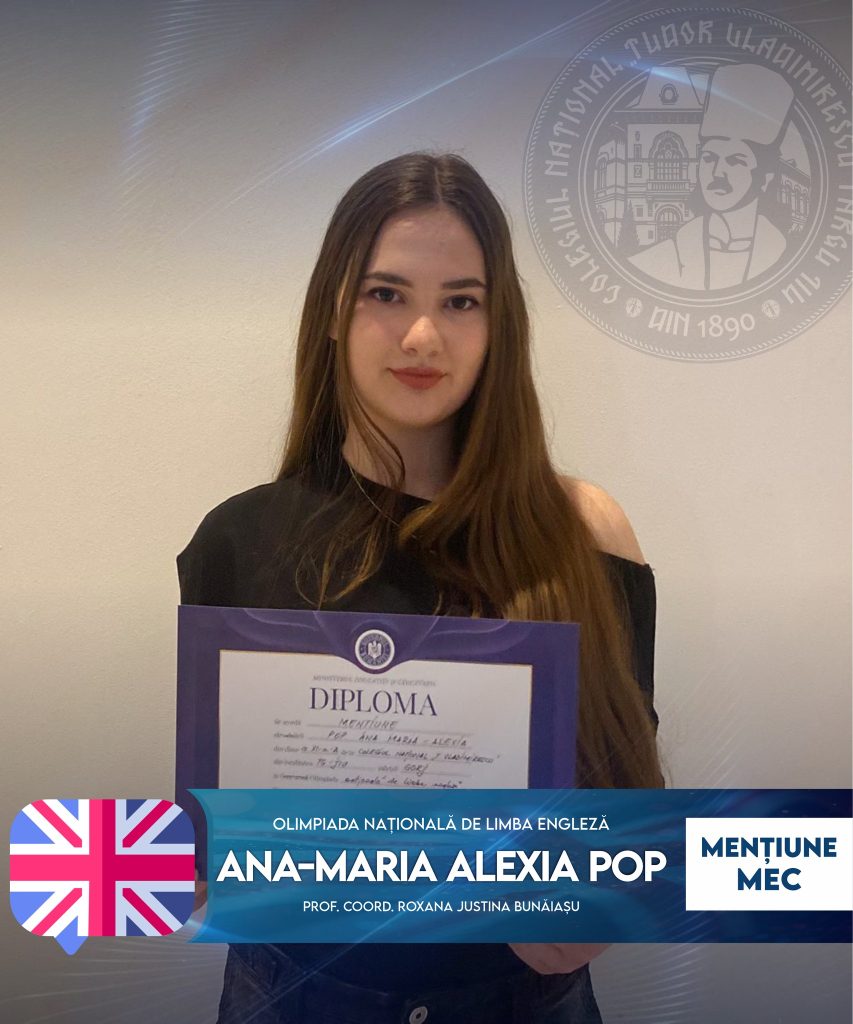 Felicitări elevei noastre, Ana-Maria Alexia Pop (11A), pentru rezultatul deosebit obținut la Olimpiada Națională de Limba Engleză: Mențiune MEC!