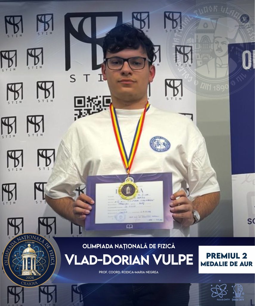 Felicitări elevului nostru, 𝗩𝗹𝗮𝗱-𝗗𝗼𝗿𝗶𝗮𝗻 𝗩𝘂𝗹𝗽𝗲 (12A), pentru rezultatul de excepție obținut la Olimpiada Națională de Fizică: Premiul II, Medalie de Aur și calificarea la proba de baraj pentru lotul olimpic. Felicitări doamnei prof. coord. Rodica-Maria Negrea!