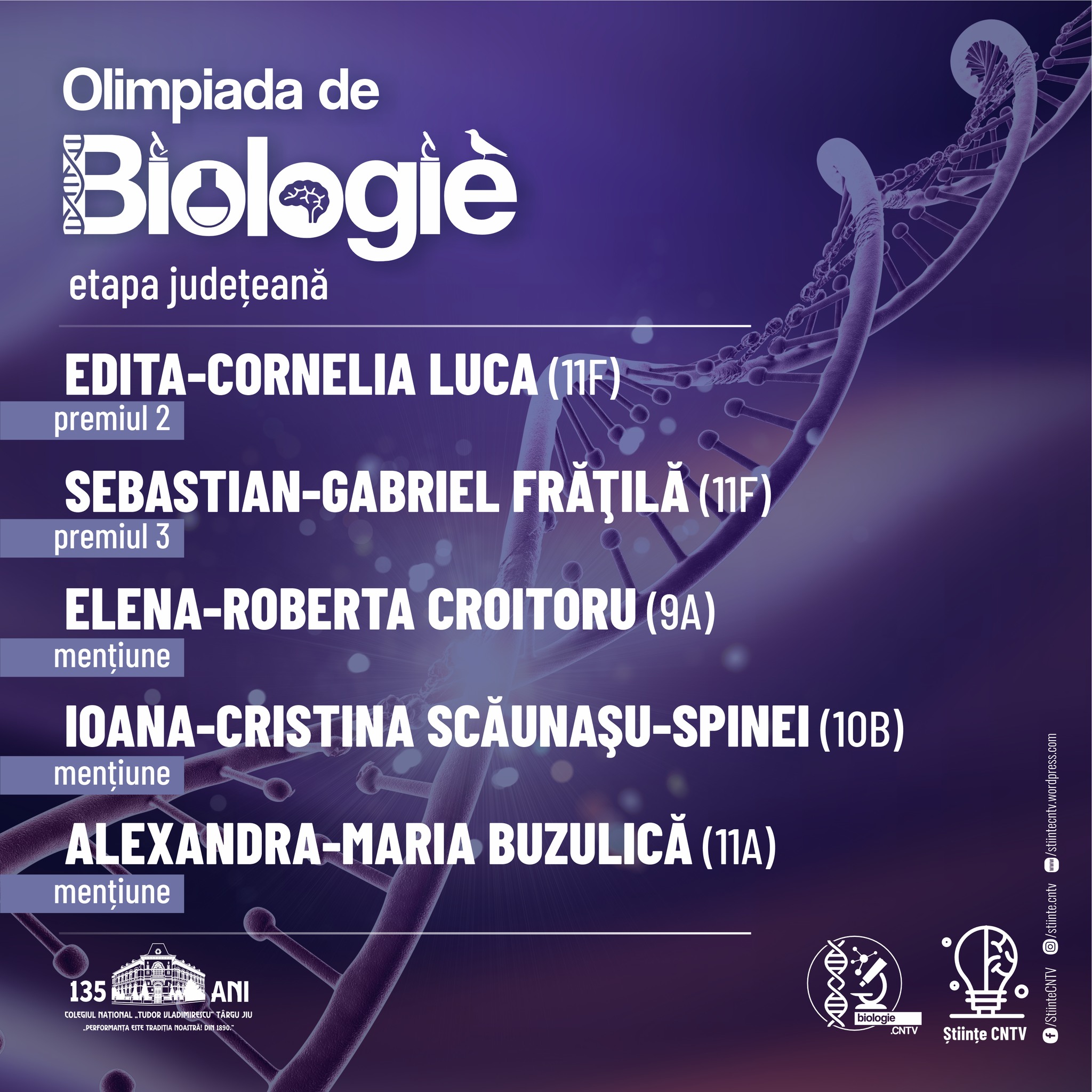 Felicitări elevilor și profesorilor coordonatori pentru rezultatele obținute la Olimpiada Județeană de Biologie!
