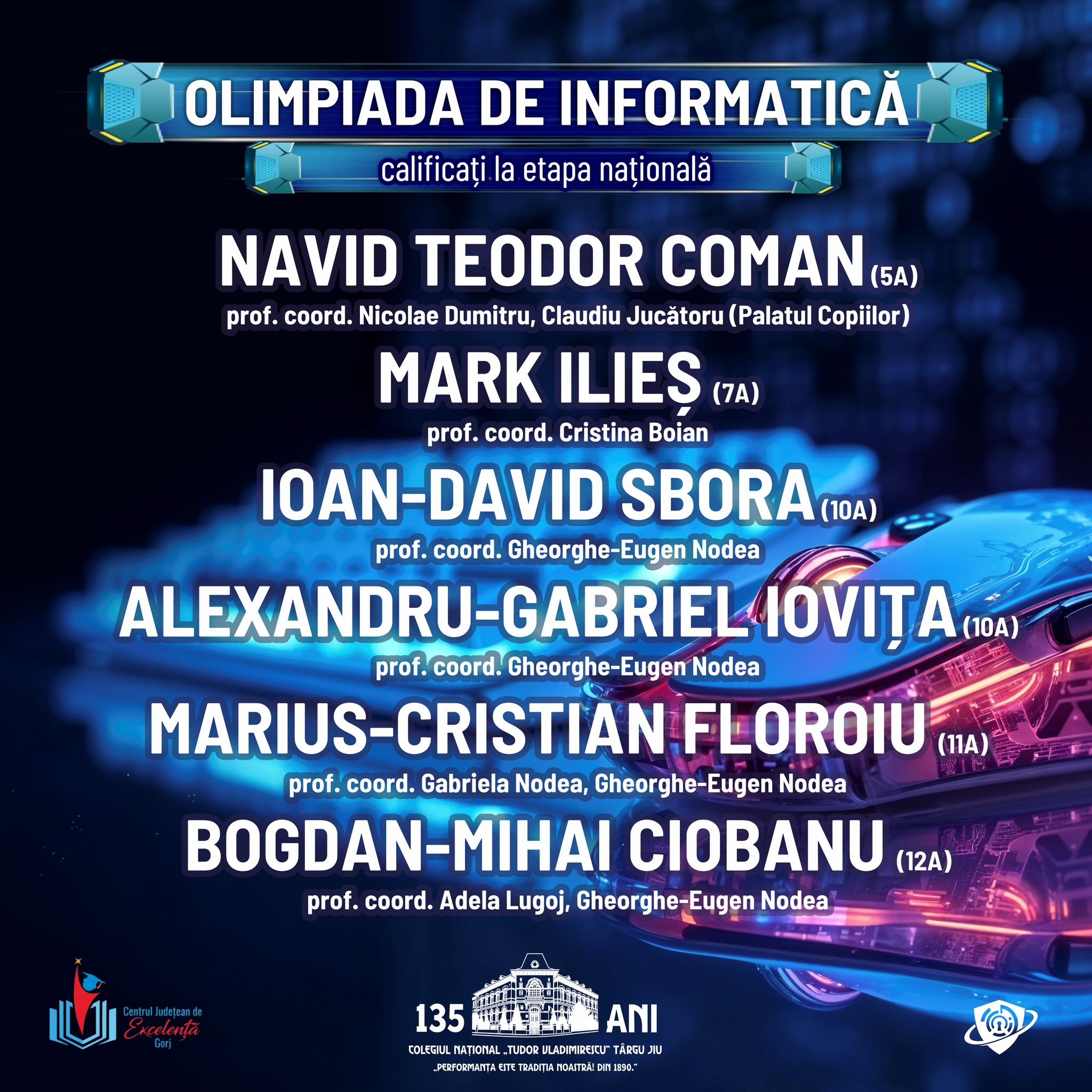 Felicitări elevilor și profesorilor coordonatori pentru rezultatele deosebite obținute la Olimpiada Națională de Informatică – etapa județeană din 2 martie 2026: